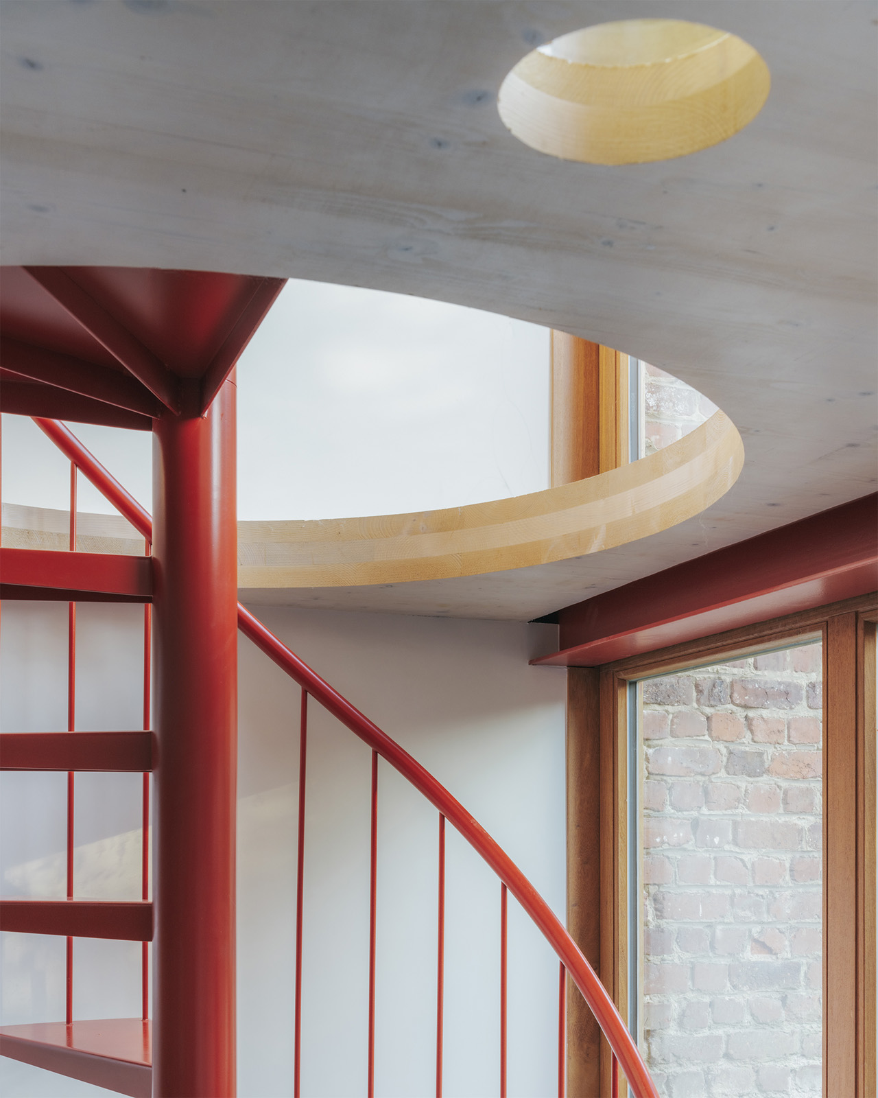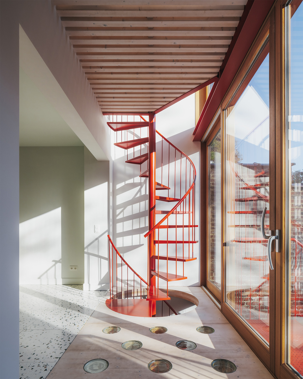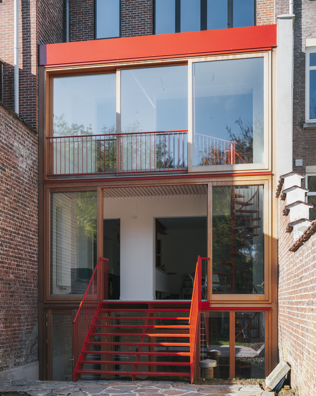 The tectonic approach emphasizes a lightweight, dry-assembly construction logic. The floors of the extension utilize slender steel beams and permeable wooden structures—a perforated CLT panel on the ground floor and timber lattice work above—to dissolve the visual boundary between levels while minimizing structural load. Defined by a stack of expansive sliding windows in FSC-certified timber frames, the façade can be completely retracted, transforming the glazed volume into a series of open-air terraces.