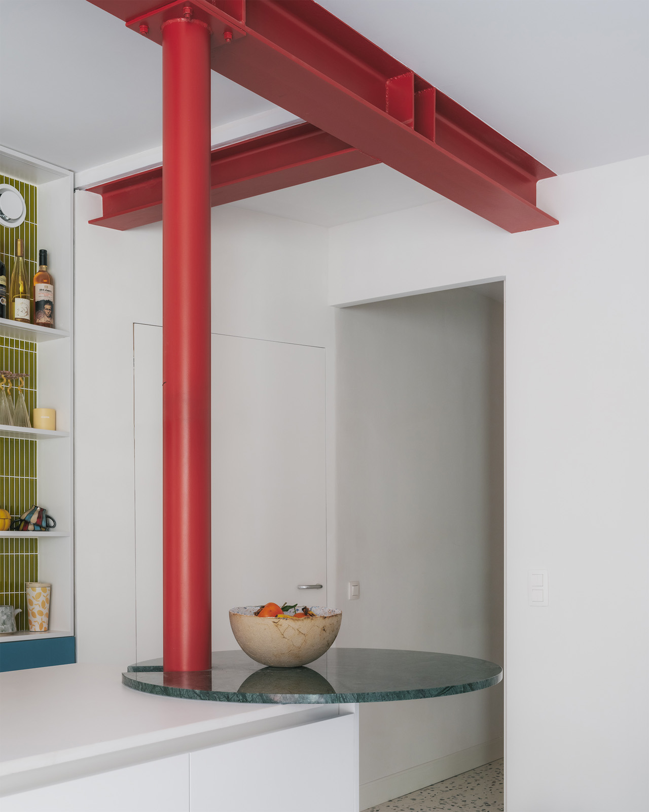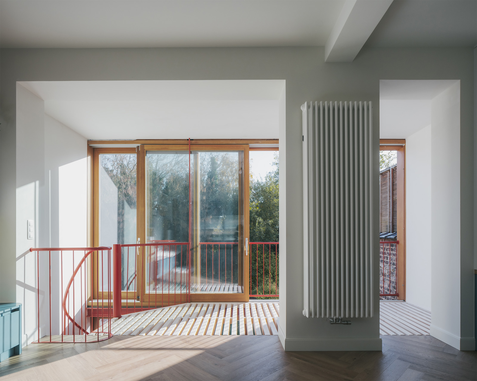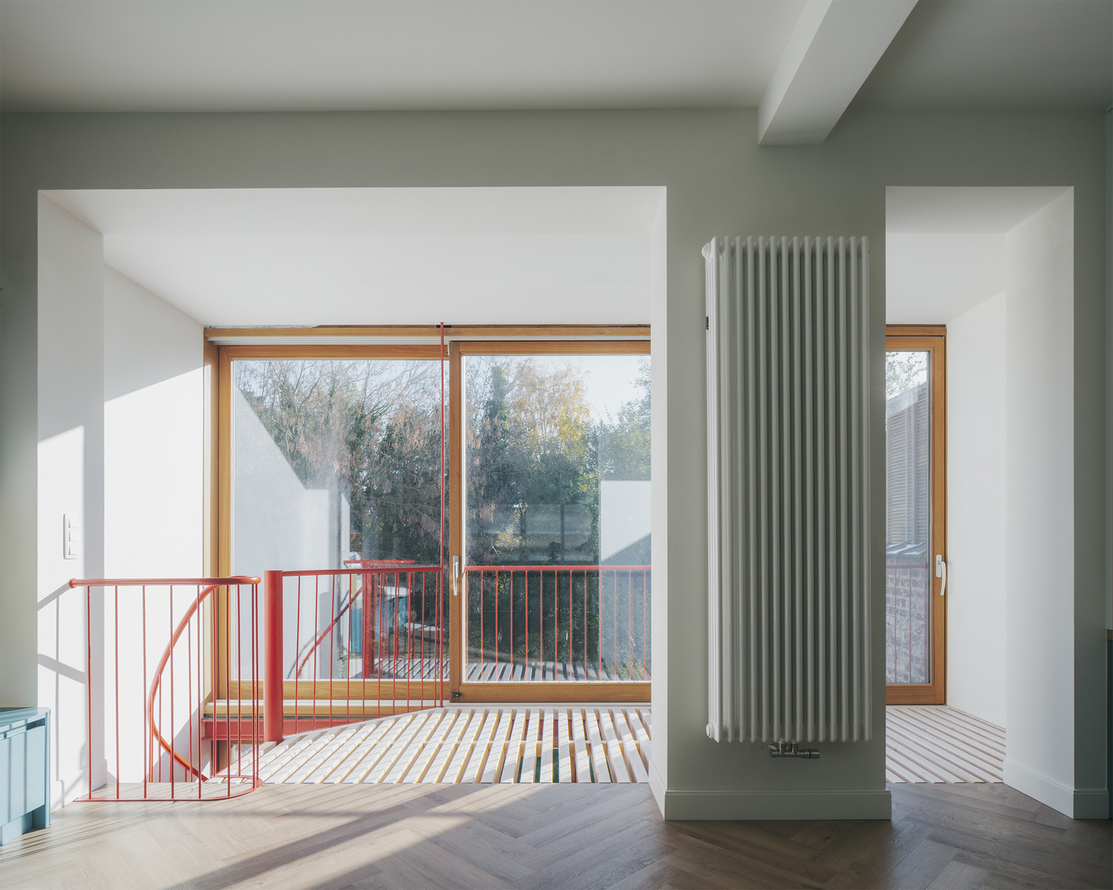This architectural addition acts as a multi-functional filter: it is at once a circulation core, a winter garden, and an extension of the living zones. The program is reimagined as an atypical vertical stack, where the kitchen, dining, and living spaces orient themselves toward the exterior. The sous-sol is activated, transformed into a garden-level guest suite and office.