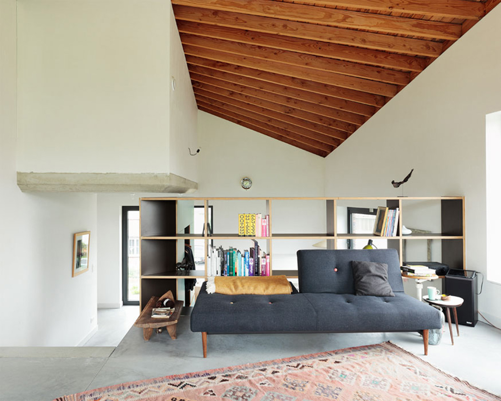 This house is set on a hilly terrain in Duisburg, a community in the agricultural outskirts of Brussels. The traditional gable roof, an urbanistic requirement for this area, usually creates rather introverted volumes. In this project it was inverted and rotated, re-defining its qualities. With the highest points at the volumes' corners and the lowest in the centre, the house opens up to the surrounding landscape. Combined with the sloping terrain, this creates a double high living space on the garden side, and a split-level with mansarde bedroom on the street. Both inside this volume and out, the roof is the protagonist. Constructed as a series of straight beams set at different angles, it creates a curved and ever-changing surface. Under this untreated wood surface, the interior organisation is designed as a continuous spatial experience, with all main spaces laid out in a doorless spiral pattern around a central core, ending in a ladder to a rooftop terrace. The built-in furniture further enhances the interior's continuity, creating functional 'rooms' under the roof's surface while allowing for diagonal see-throughs.