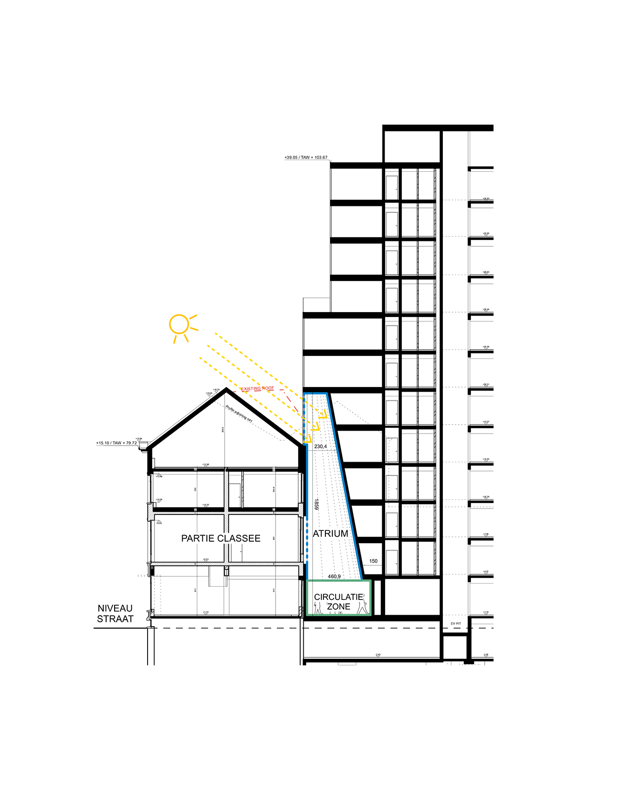 As part of the Millennium project in the 1990s, the heritage buildings were encapsulated by a massive office structure. The numerous connections between the office and the townhouses resulted in a fragmented circulation. The new proposal clearly defines three distinct architectural entities, each expressed in the façades. Unnecessary links between the buildings are removed, while a revised circulation layout within the townhouses restores their original spatial integrity.